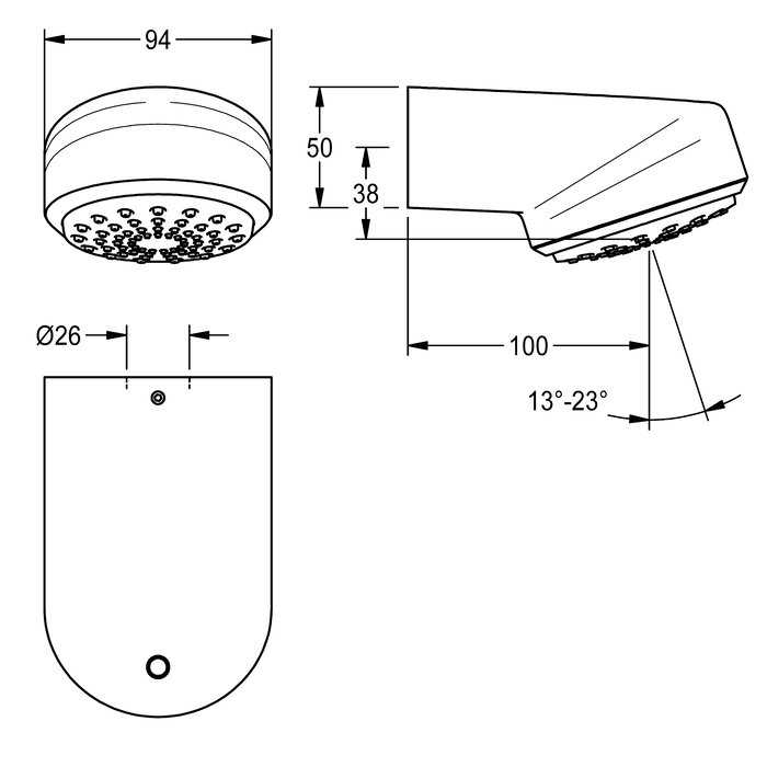 AQUAJET-Comfort douchekop met traploos in hoek verstelbare kunststof straalbodem 13° - 23°, met antikalksysteem en geringe aerosolvorming. Voor montage aan KWC-douchepanelen met voorgemonteerd aansluitstuk DN 15, diameter 26 mm, behuizing verchroomd gepolijst messing.