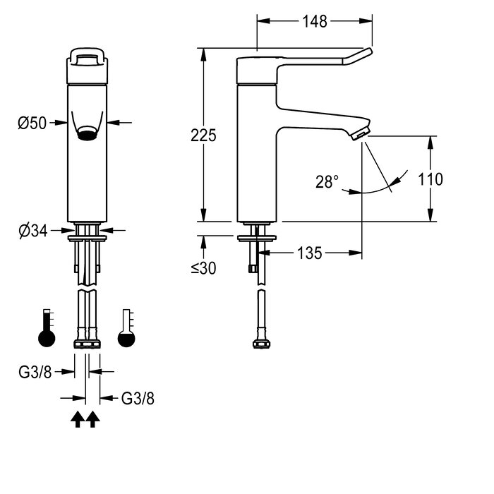 F4LT-Med thermostaat-ééngreepsmengkraan als mengkraan DN 15 voor wastafels in de gezondheidszorg en verzorging, lengte hendel 148 mm. Thermostatisch geregeld mengpatroon met expansie-element en actieve bescherming tegen verbranding, intrinsiek beveiligd tegen terugstroming evenals instelbare, tegen doordraaien beveiligde temperatuuraanslag en keramische schijftechniek. Zonder terugslagbegrenzer voor een optimale hygiëne van het drinkwater. Hendelkap ergonomisch ontworpen in beugelvorm, aan de voorzijde licht gebogen en gecoat in basaltgrijs, volgens het 2-zintuigprincipe (tactiel en visueel). Voor aansluiting op warm en koud water met slangen inclusief zeven. Voor reiniging geoptimaliseerde armatuurvorm, volledig uitgevoerd in metaal, loodarm messing (loodgehalte ≤ 0,2%) gepolijst verchroomd, met watertoevoer met gereduceerd volume zonder nikkelcoating. Laminaire straalregelaar met geïntegreerde debietregelaar 8,0 l/min, uitloopsprong 135 mm.