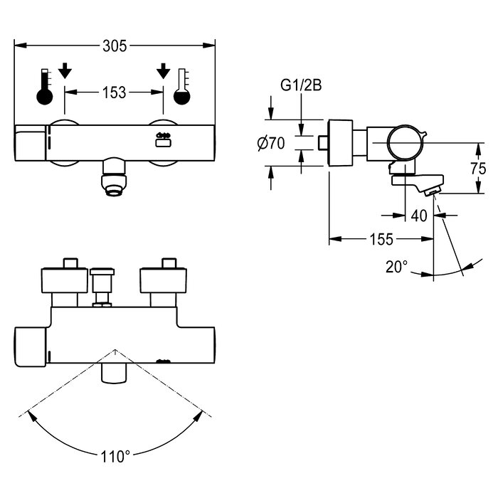 F5E-Therm thermostaatwandkraan DN 15 voor wandmontage met vergrendelbare zwenkuitloop, voor wastafels. Opto-elektronisch gestuurd, bediening via handreflectie. Thermostaat met metalen greep met instelbare en tegen doordraaien beveiligde temperatuuraanslag. Met mogelijkheid voor thermische desinfectie, handmatig of automatisch via voorgemonteerde desinfectie-eenheid. Voor aansluiting op warm en koud water. Besturingselektronica, patroon voorzien van magneetventielen sensor in verbrandingsveilige Safe-Touch-behuizing, messing gepolijst verchroomd. Laminaire straalregelaar met geïntegreerde debietregelaar 6,0 l/min. Met verstelbare en afsluitbare aansluitingen met terugslagbegrenzers en zeven, volledig afgedekt door in diepte verstelbare schroefrozetten. Uitloopsprong 155 mm. Geactiveerde hygiënische spoeling 24 uur na laatste bediening, veiligheidsuitschakeling bij continue reflectie en opslag van statistische gegevens. Met mogelijkheid voor parametrering en communicatie via optionele bidirectionele afstandsbediening. Aparte voeding via netvoeding 6,75 V / 12 V DC of AQUA 3000 open systeemtoebehoren.
