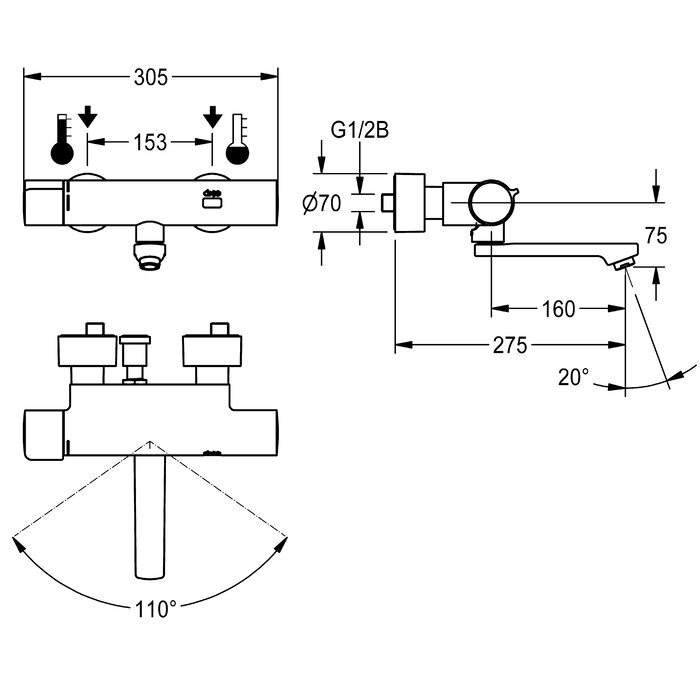 F5E-Therm thermostaatwandkraan DN 15 voor wandmontage met vergrendelbare zwenkuitloop, voor wastafels. Opto-elektronisch gestuurd, bediening via handreflectie. Thermostaat met metalen greep met instelbare en tegen doordraaien beveiligde temperatuuraanslag. Met mogelijkheid voor thermische desinfectie, handmatig of automatisch via voorgemonteerde desinfectie-eenheid. Voor aansluiting op warm en koud water. Besturingselektronica, patroon voorzien van magneetventielen sensor in verbrandingsveilige Safe-Touch-behuizing, messing gepolijst verchroomd. Laminaire straalregelaar met geïntegreerde debietregelaar 6,0 l/min. Met verstelbare en afsluitbare aansluitingen met terugslagbegrenzers en zeven, volledig afgedekt door in diepte verstelbare schroefrozetten. Uitloopsprong 275 mm. Geactiveerde hygiënische spoeling 24 uur na laatste bediening, veiligheidsuitschakeling bij continue reflectie en opslag van statistische gegevens. Met mogelijkheid voor parametrering en communicatie via optionele bidirectionele afstandsbediening. Aparte voeding via netvoeding 6,75 V / 12 V DC of AQUA 3000 open systeemtoebehoren.
