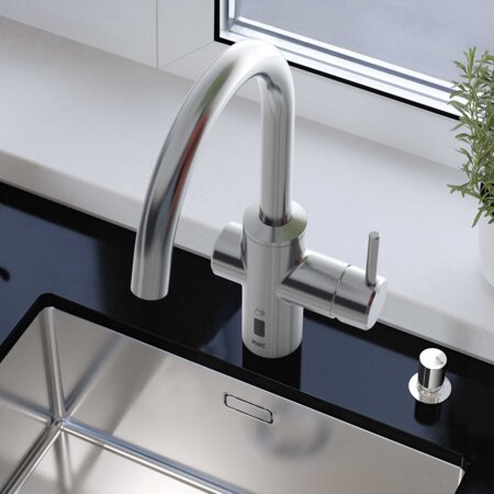 Efektivní používání vody a energie pomáhá optimalizovat provozní náklady v kancelářských a administrativních budovách. Elektronické armatury dnes patří v umývárnách v těchto budovách ke standardu. Současně přispívají k zajištění hygieny pitné vody. Ve většině kuchyněk na jednotlivých patrech kancelářských budov se dnes ovšem často nacházejí běžné kuchyňské armatury s ovládací pákou. Nová hybridní kuchyňská armatura F5 od KWC Professional spojuje výhody elektronické armatury s jednoduchým používáním pákové směšovací baterie.
