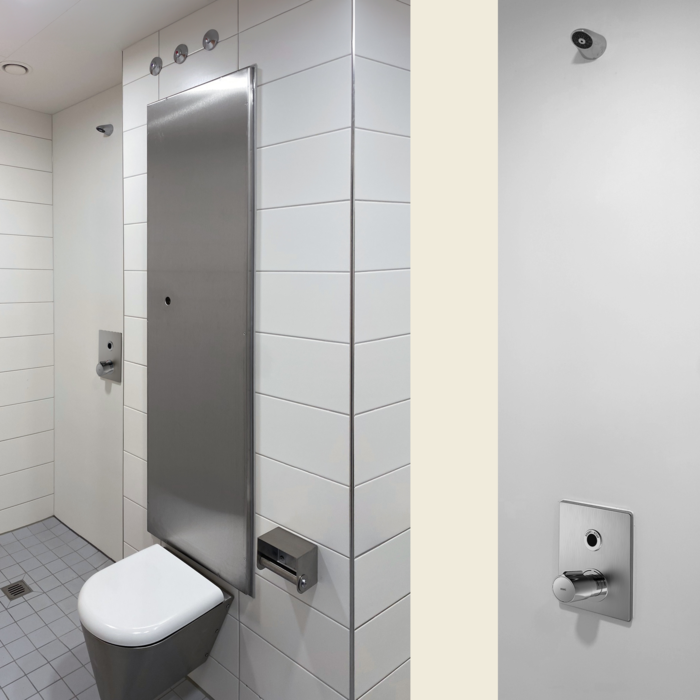 Thermostat-Einbaubatterie mit suizidhemmendem Duschkopf. Das Edelstahl-WC der Serie CAMPUS sowie diverse Accessoires wie Toilettenrollenhalter, Papierhandtuchspender, Abfallbehälter etc. komplettieren die Ausstattung des Sanitärbereichs.
