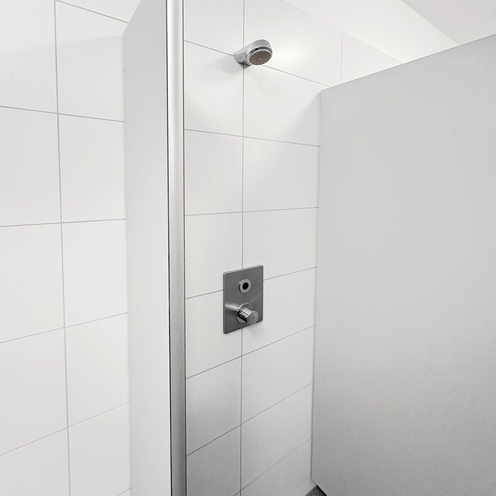 Die sanierten Duschräume sind mit modernen Einzel-Duschkabinen ausgestattet, die über elektronische F5 Thermostatbatterien mit Hygienespülfunktionen und passenden AQUAJET-Comfort Duschköpfen verfügen.