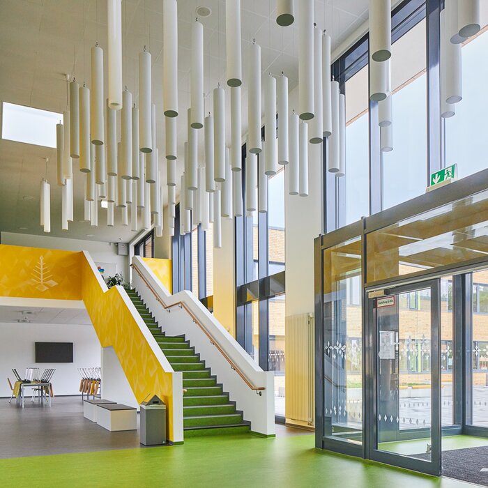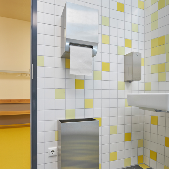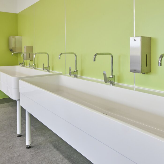 Det arkitektoniska färgkonceptet återspeglas i alla skolsalar, som utrustades med produkter från KWC Professional. Förutom skållningssäkra F5 duscharmaturer och många tillbehör i kromnickelstål från RODAN och EXOS, imponerar också de sömlöst gjutna MIRANIT arbetslokalstvättställ i konst- och arbetsrummen.