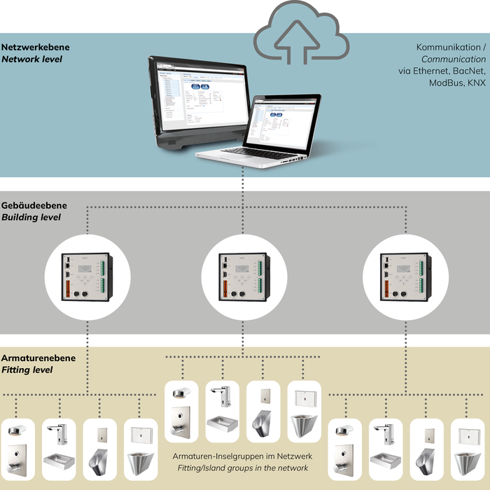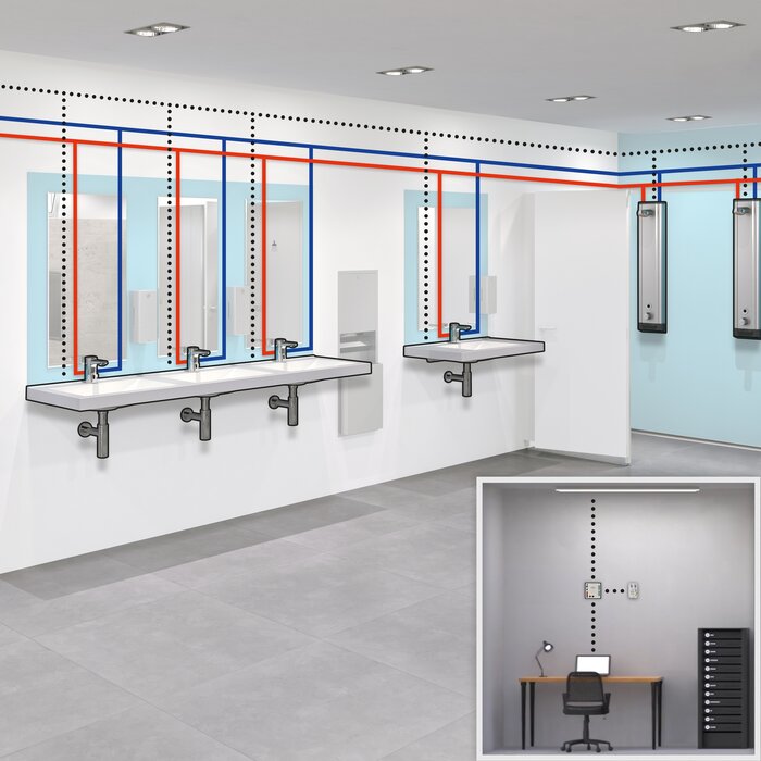 Säker hygien i hela byggnaden: AQUA 3000 open är vårt centrala vattenförvaltningssystem för kontroll av vattenförsörjningen i alla tvätt-, dusch- och sanitetsutrymmen.