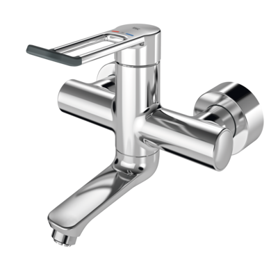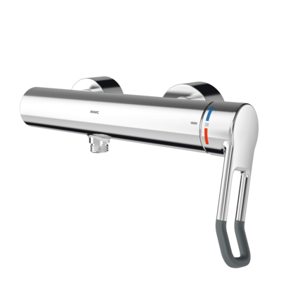 F4-engreppsblandaren med termostat är perfekt för utrustning av patientbadrum. De innovativa tvättoch duschblandarna med inbyggd termostatpatron ger säker tvätt- och duschkomfort samt ett aktivt skållningsskydd.
