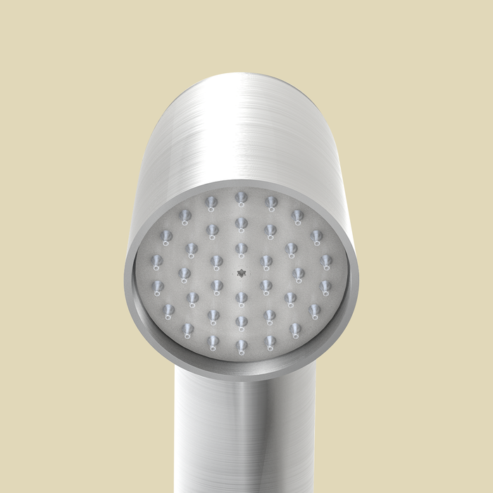 Duschhuvudet har en bas i kromnickelstål och munstycken i silikon som förhindrar problem med kalkbildning. Det robusta monteringsstativet tillåter en säker, upprätt installation med vattenanslutning underifrån till färdigblandat varmt eller kallt vatten.
